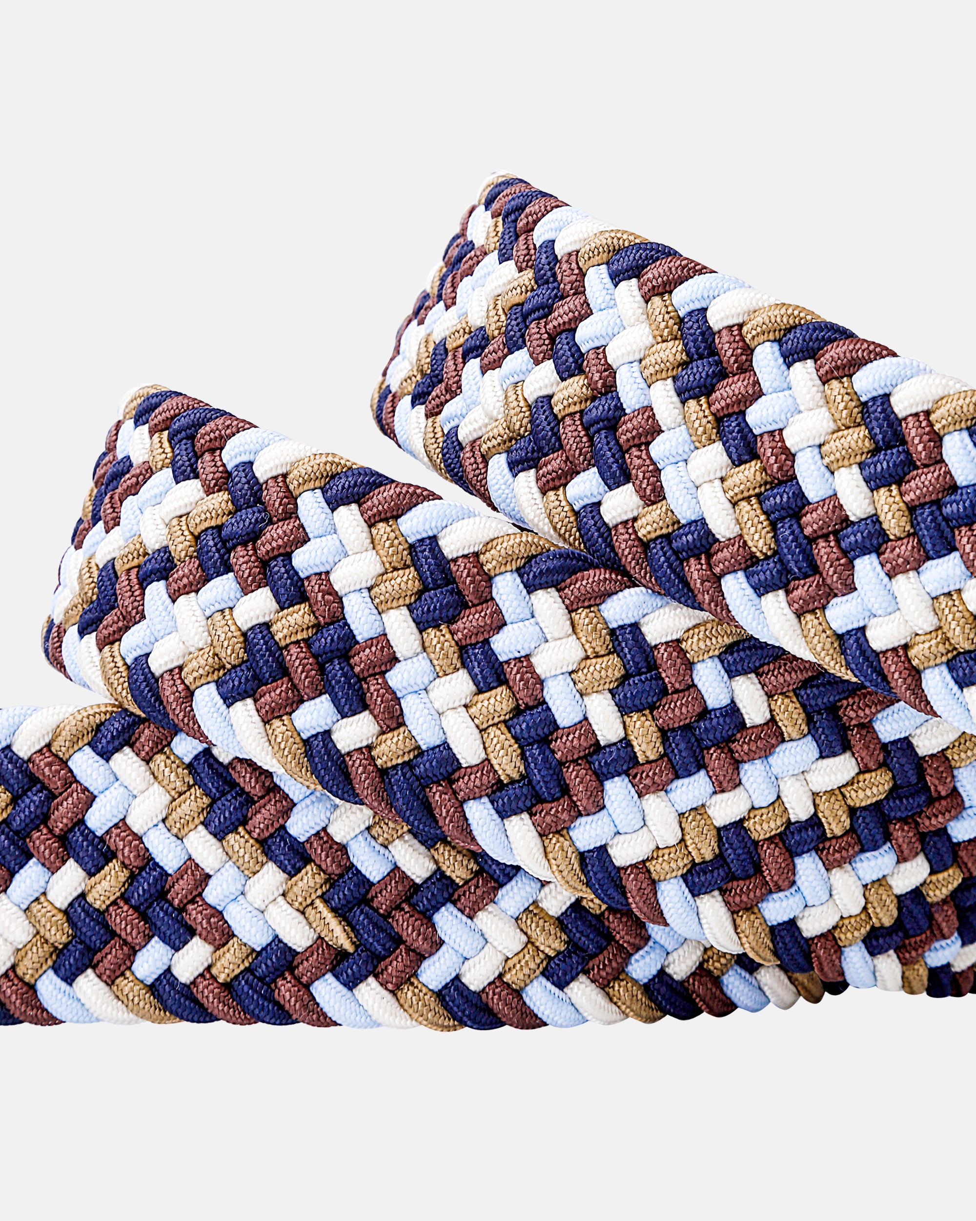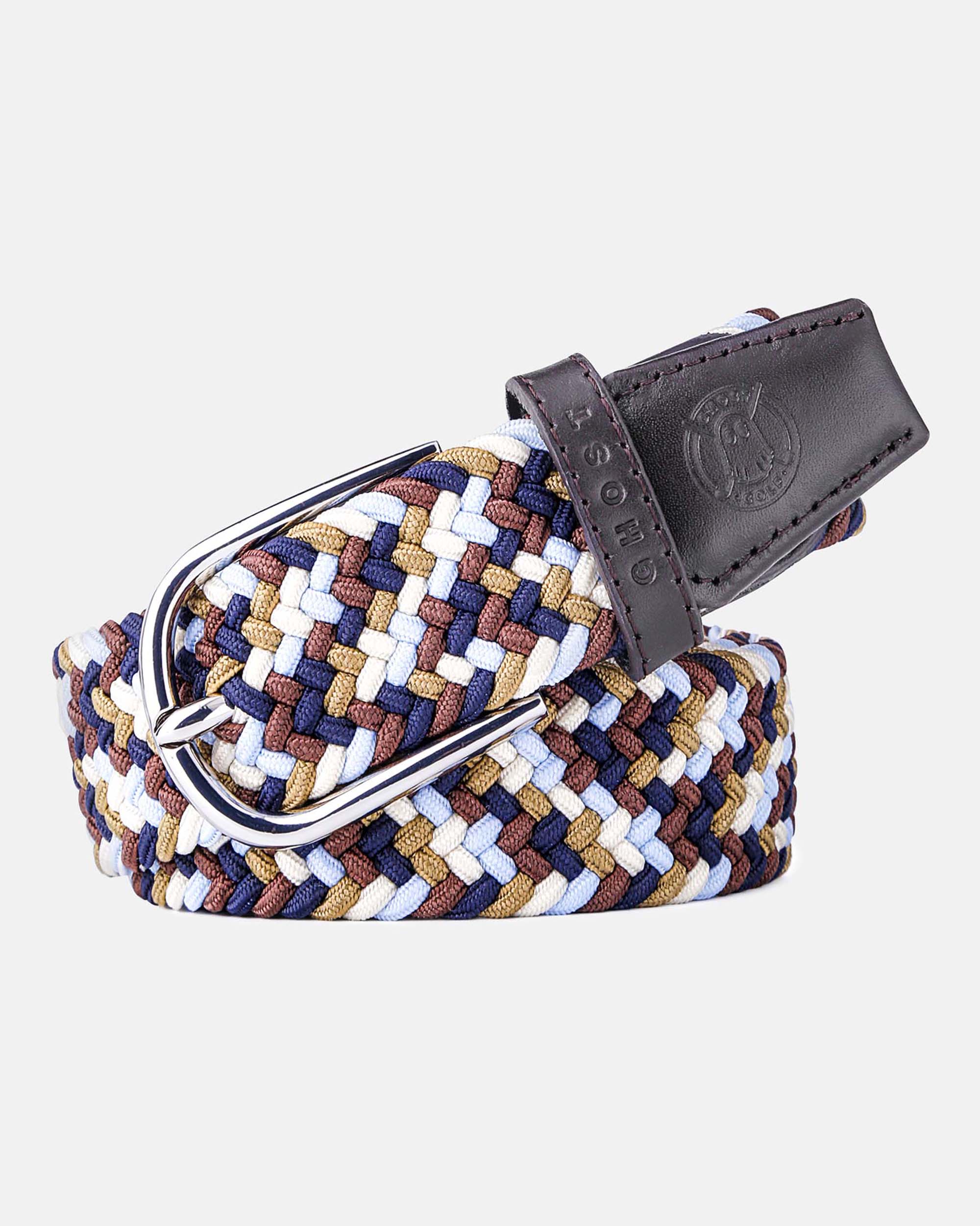 Style: Braided Belt 84% Polyester, 16% Elastane Stretch-fit woven webbing provides extra stretch & flexibility Width: 1.4″ / 3.5 cm Dark Brown/Navy Blue/Khaki Multi Color Belt with Rounded Steel Buckle and Dark Brown Leather Tail with Ghost Logo Designed for extreme comfort to be worn on & off the course Need help sizing?ย Seeย beltย sizing chartย below