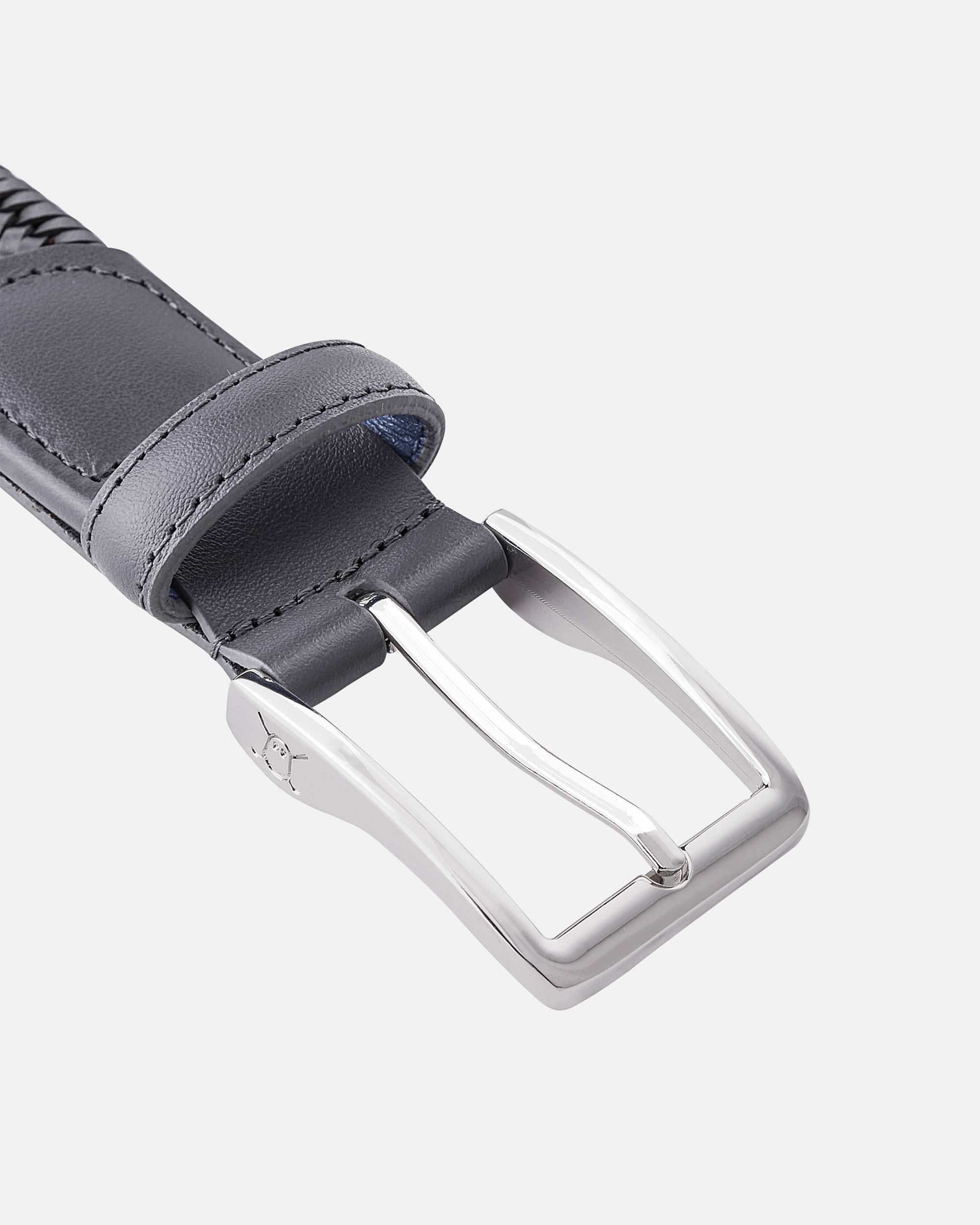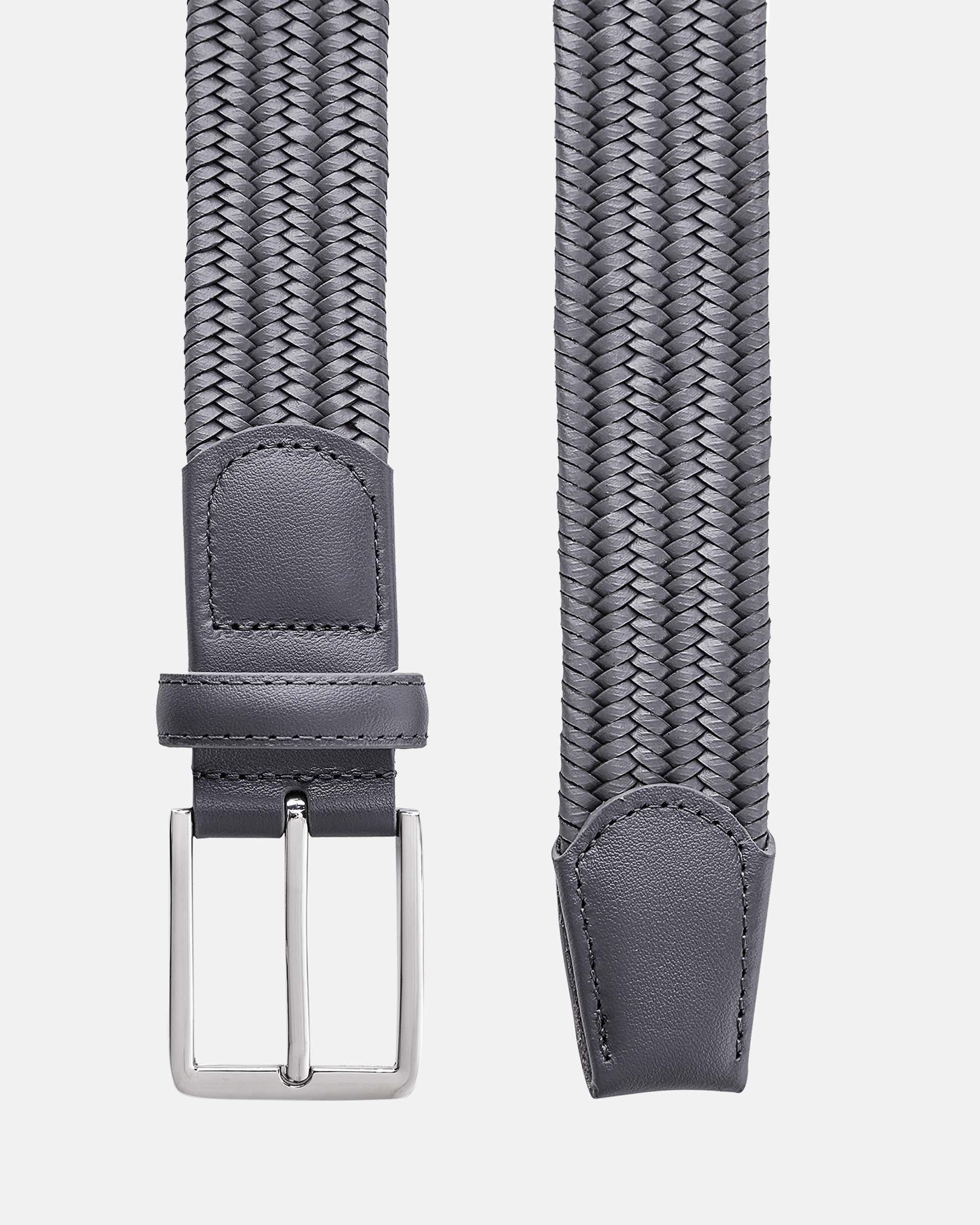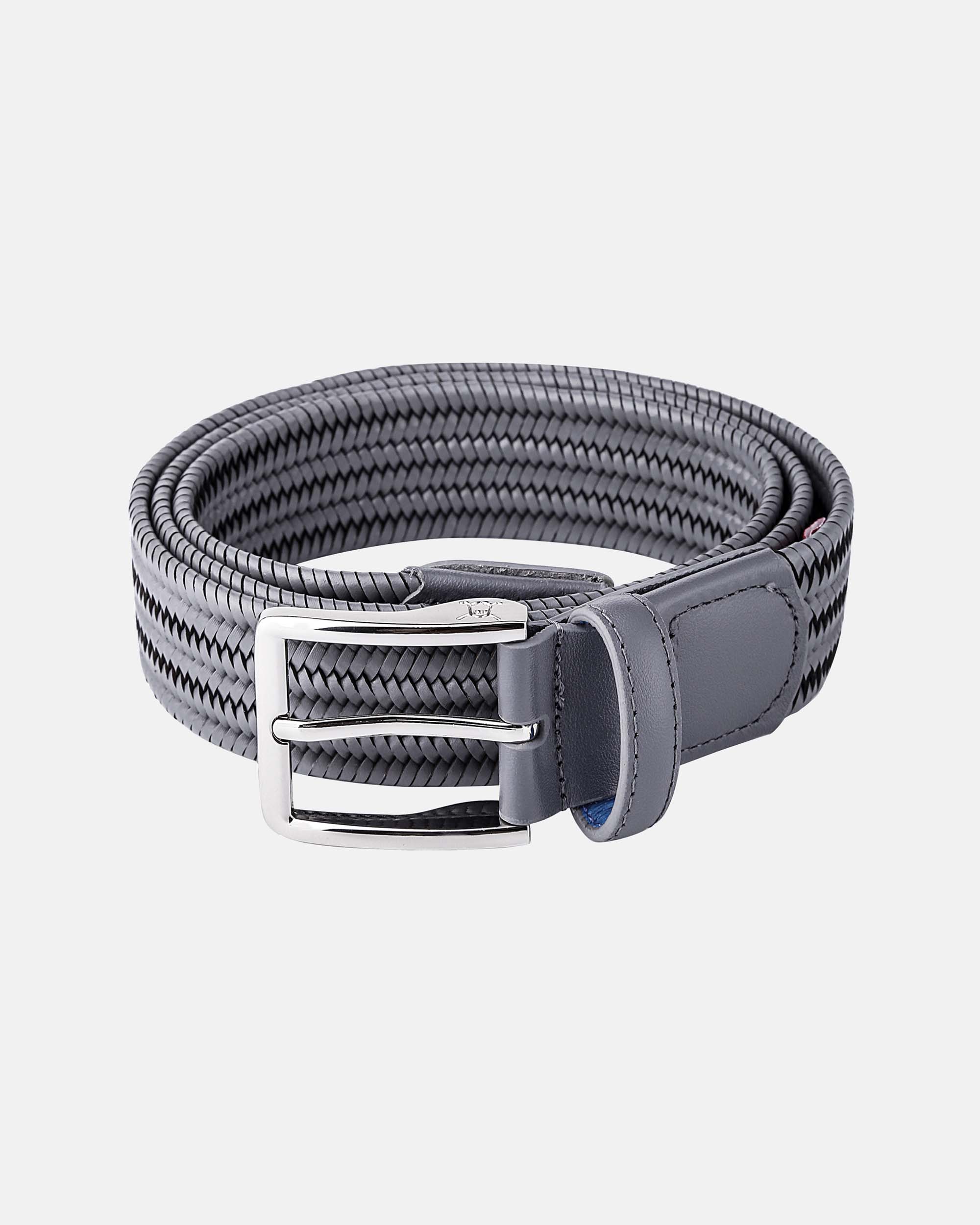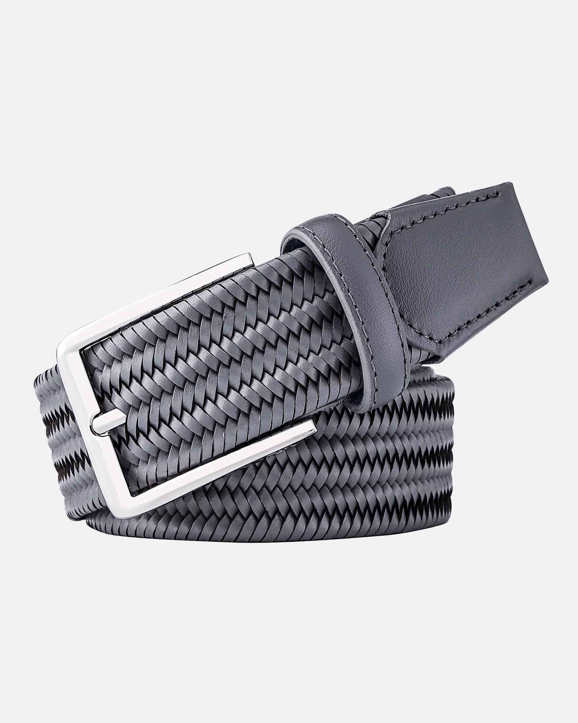 Style: Signature Braided Leather Belt Belt Head and Tip made from Genuine Full Grain Italian Leather Stretch-fit woven webbing provides extra stretch & flexibility Width: 1.4″ / 3.5 cm Gray Regenerated Italian Leather Belt with Custom Steel Buckle Designed for extreme comfort to be worn on & off the course Need help sizing?ย Seeย beltย sizing chartย below